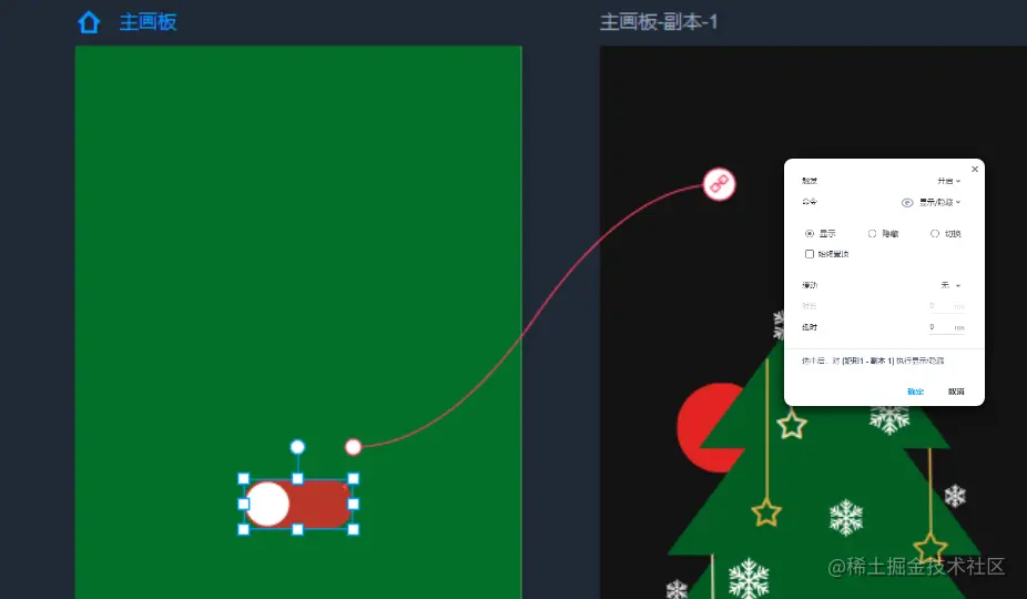 拖动「开关」按钮右上角的红圈,并链接到辅助画板(注意,一定是连接画板,不是画板上的某个元素),链接后完成交互设置。