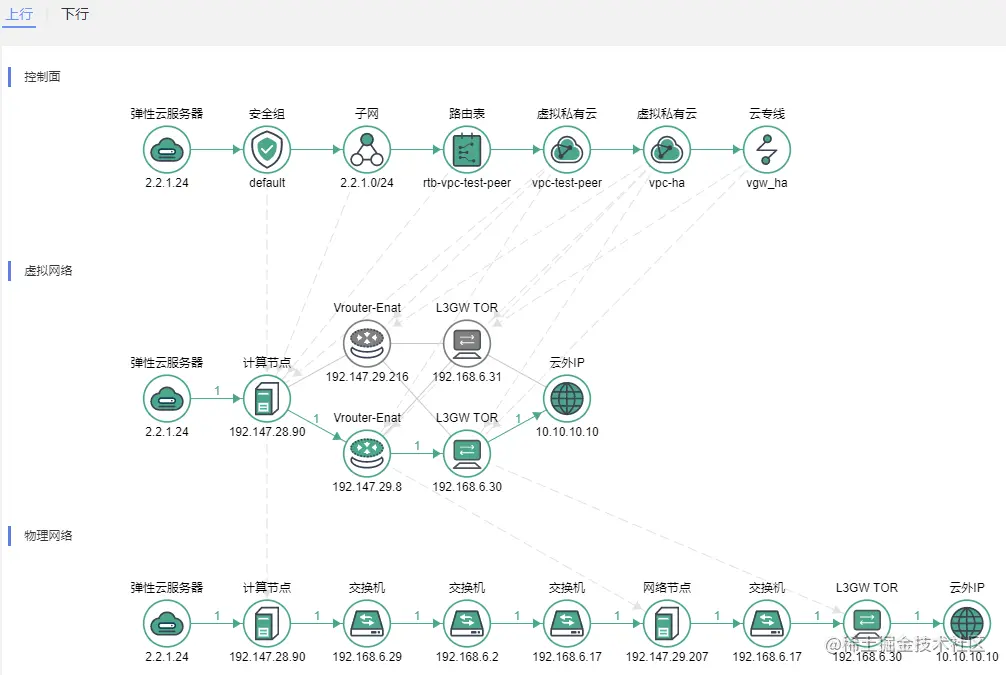 虚拟网络路径中的网元节点映射到物理网络路径中的网元宿主机,即网络节点。物理网络路径可以直观展示两个网元节点之间的物理网络设备信息。下图展示了源IP和目的IP之间的物理网络设备,图中可以看到计算节点和网络节点之间经过的交换机设备。