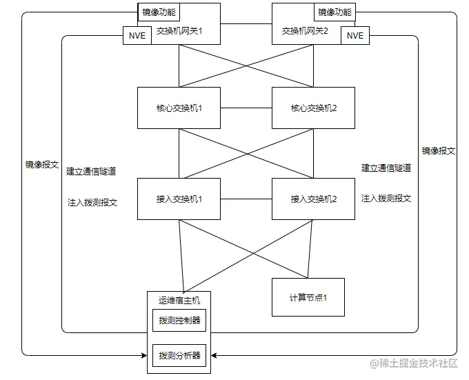 针对硬件交换机网关拨测全链路有自己的解决之道。首先,硬件交换机与运维程序宿主机建立通信隧道,拨测控制器把拨测报文通过该隧道发送到硬件交换机上。其次,交换机需要支持基础的报文镜像功能,用于把拨测报文镜像到拨测分析器;最后,在交换机网关上配置出云方向拨测报文丢弃策略,防止拨测报文影响用户业务。