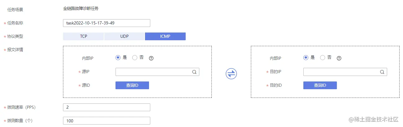 对于使用全链路的用户来说,只需要知道需要探测的源IP和目的IP,选择拨测协议类型,如果选择TCP和UDP协议,用户还需要输入源端口和目的端口。用户不需要学习复杂的网络知识,即可使用全链路进行网络运维,非常的简单和易用。