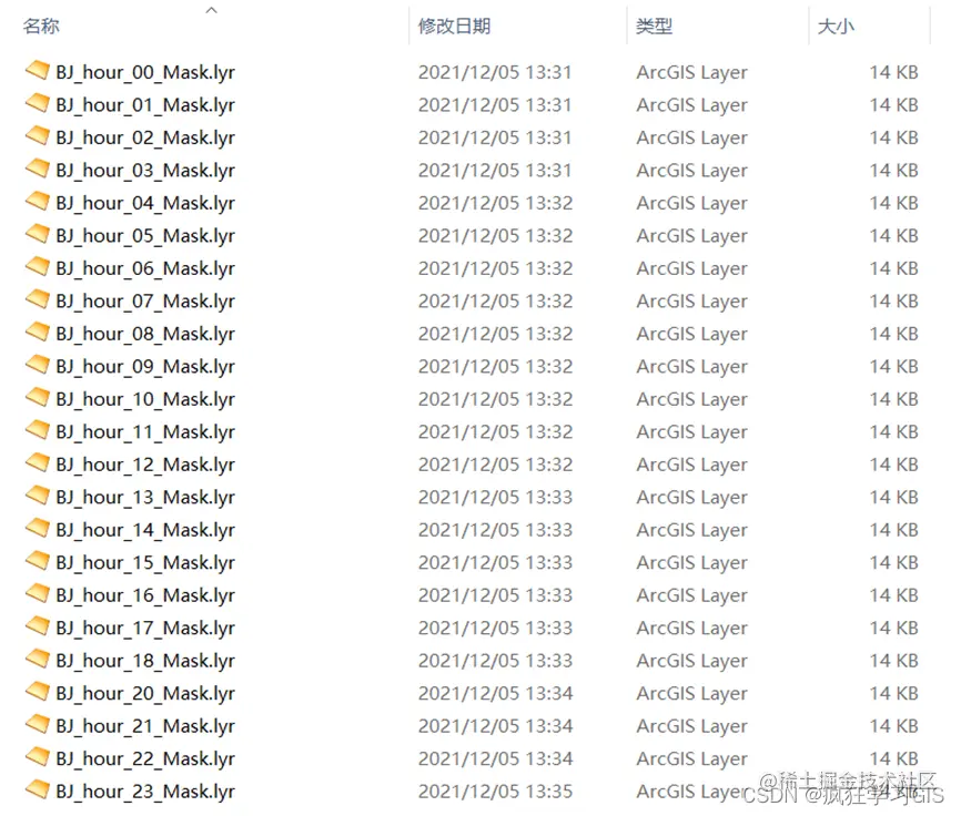 我们希望做到的有两点。首先,我们可以看到前述23个栅格图层的符号系统都为灰度拉伸的状态,因此希望按照一个给定的模板图层文件m.lyr,调整这23个栅格图层的样式(即拉伸的颜色),并分别以.lyr格式导出这23个栅格图层文件;且希望导出图层文件的文件名包含具体的时刻。如下图所示。