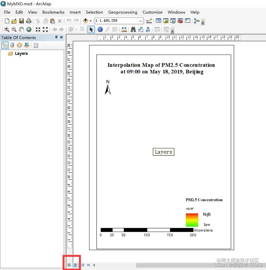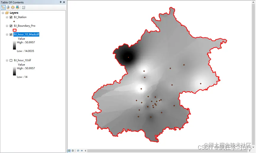 现有通过Python ArcPy读取Excel数据、批量IDW反距离加权插值与掩膜所绘制的北京市在2019年05月18日00时至23时(其中不含19时)等23个逐小时PM2.5浓度插值数据栅格图层,每小时一个图层,因此共23个图层;以当日10时为例,该时刻的栅格图层如下所示。