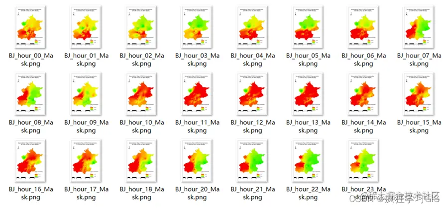 第二点希望做到的是,将每一个栅格图层都设置为彩色后,添加图名、指北针、比例尺等地图要素,并导出为图片格式。以当日10时、20时为例,我们所希望导出的图片如下所示。
