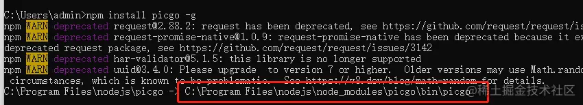 npm install picgo -g安装picgo,安装过程中会显示出安装的路径