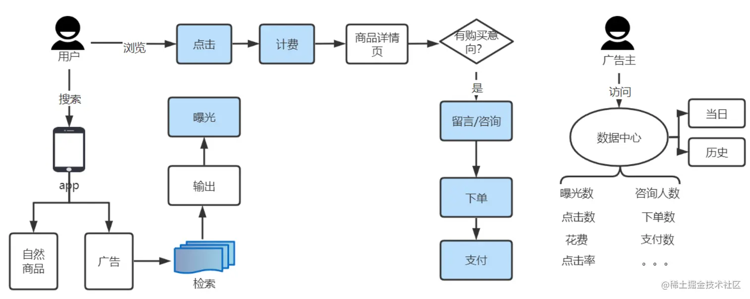 整个链路横跨多个业务,数据方面,广告主最直接的感受是曝光增加,紧接着符合用户诉求的广告商品,用户会进行浏览,浏览完觉得还不错,一般会跟商家进行沟通:是不是包邮、能不能更便宜等,双方协商一致后,用户确认购买,会进行下单操作,然后支付,至此,数据链路走完了,会产生6个核心指标:曝光、点击、计费、咨询、下单、支付。