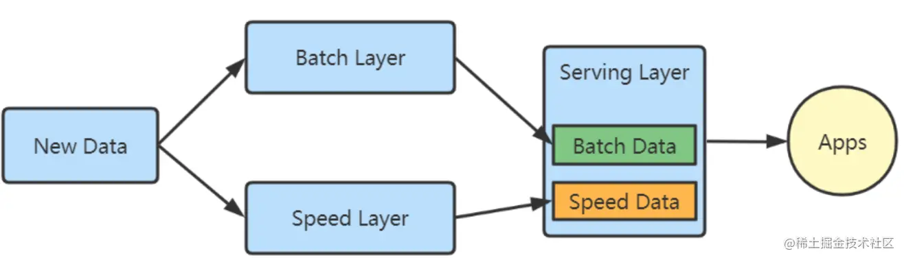 - 速度处理层(Speed layer):负责实时处理新来的大数据,延迟低,几乎收到即可使用,可能不如批处理的结果完整或准确,待批处理结束后该视图可被替换;