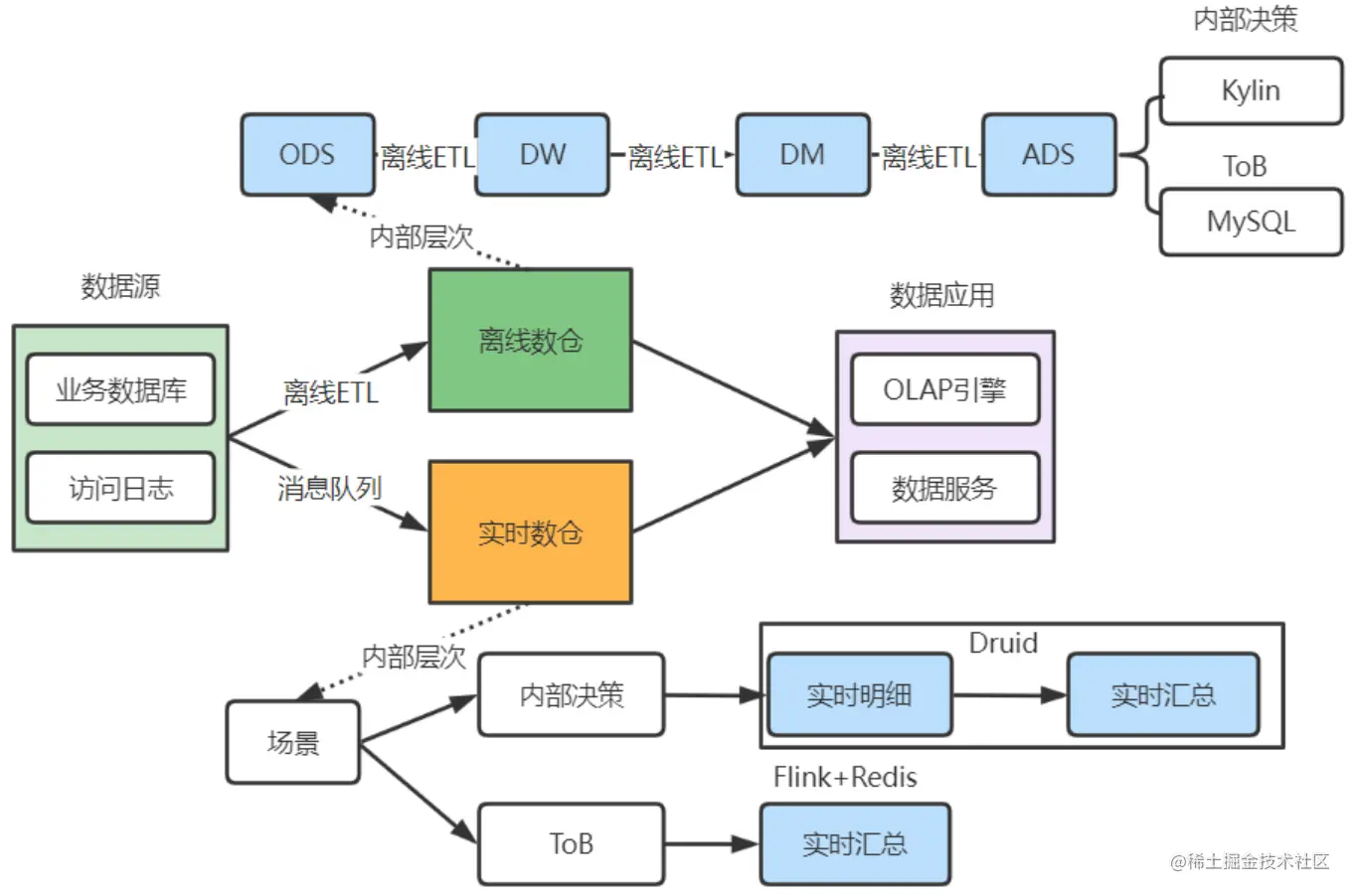拆好层次,整体数仓有了清晰地结构,离线数仓负责批处理层,实时数仓负责速度层,数据服务专门负责数据类的查询出口。