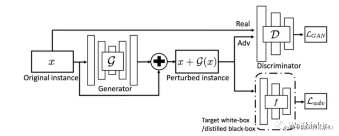 基于GAN的攻击。AdvGAN将GAN思想引对抗攻击,通过生成器生成对抗扰动,添加到干净样本中。而判别器主要负责判别输入的是对抗样本还是干净样本。整个对抗训练过程转化成GAN经典博弈过程。
