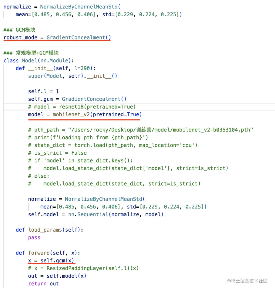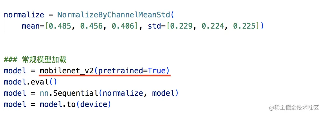 在对抗防御阶段,为了保持和对抗攻击一致,还是选用Mobilenet_v2模型,依旧使用预训练参数的形式,只是这次我们使用了class的形式,这样方便我们使用GCM模型作为防御模块嵌入模型中。