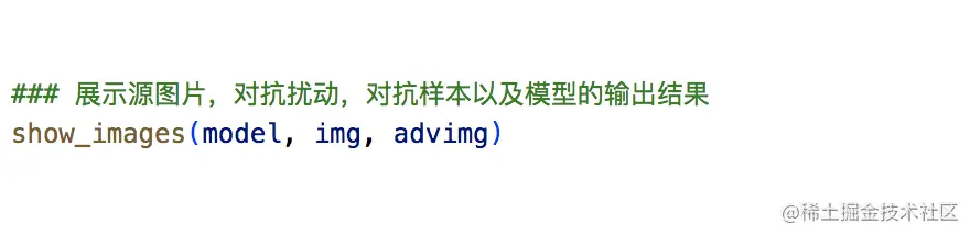 最后我们使用show_iamges函数来直观展示源图片,对抗扰动,对抗样本以及模型的输出结果。