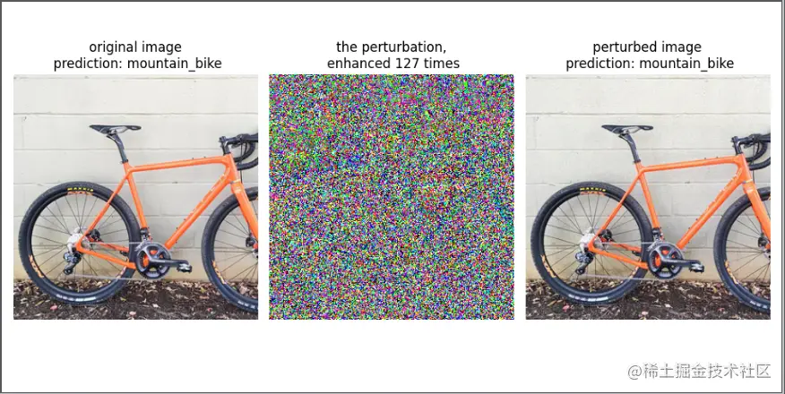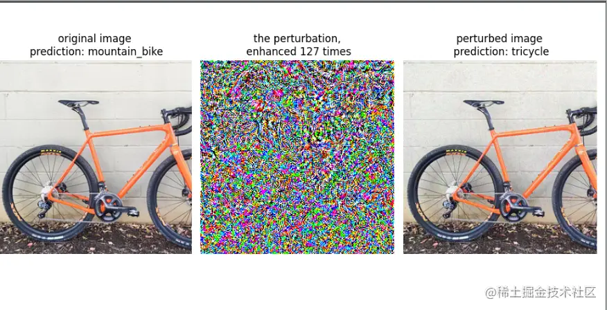 我们可以看到经过攻击后,模型将山地自行车错判成三轮车。