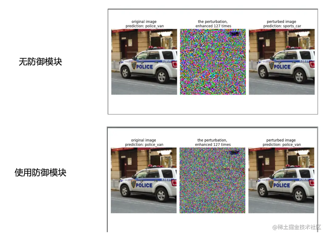 将使用防御模块后生成的对抗扰动与未使用防御模块的对抗扰动进行对比,我们可以发现,防御模块确实起到了应有的防御作用: