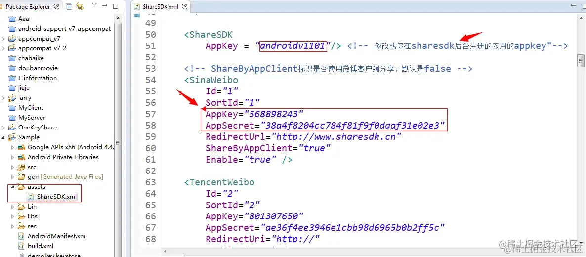 配置完以上步骤,你还需将 工程下的 assets->share.xml 文件,中的shareSDK 和你想要用得 第三方分享平台申请 的