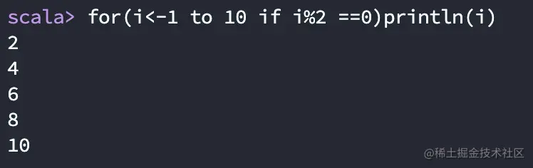 - 如果在for循环里面使用if守卫,可以在循环的时候就执行一定的逻辑,判断数值是否是偶数