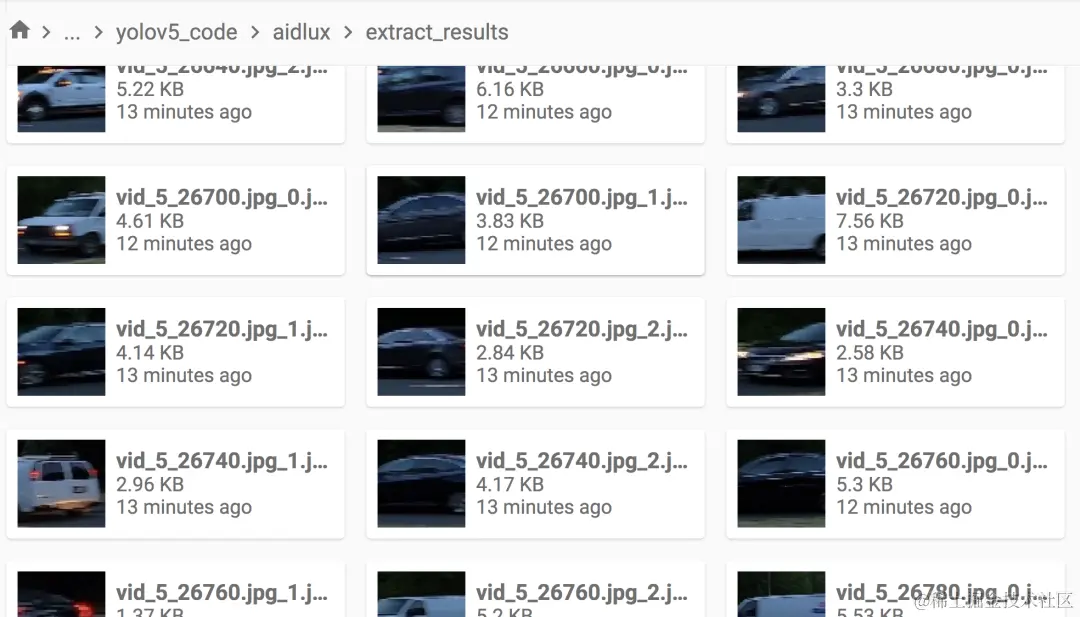 等代码运行结束,我们进入Lesson5_code/yolov5_code/aidlux/extract_results文件夹中,可以看到所有车辆目标提取图片。