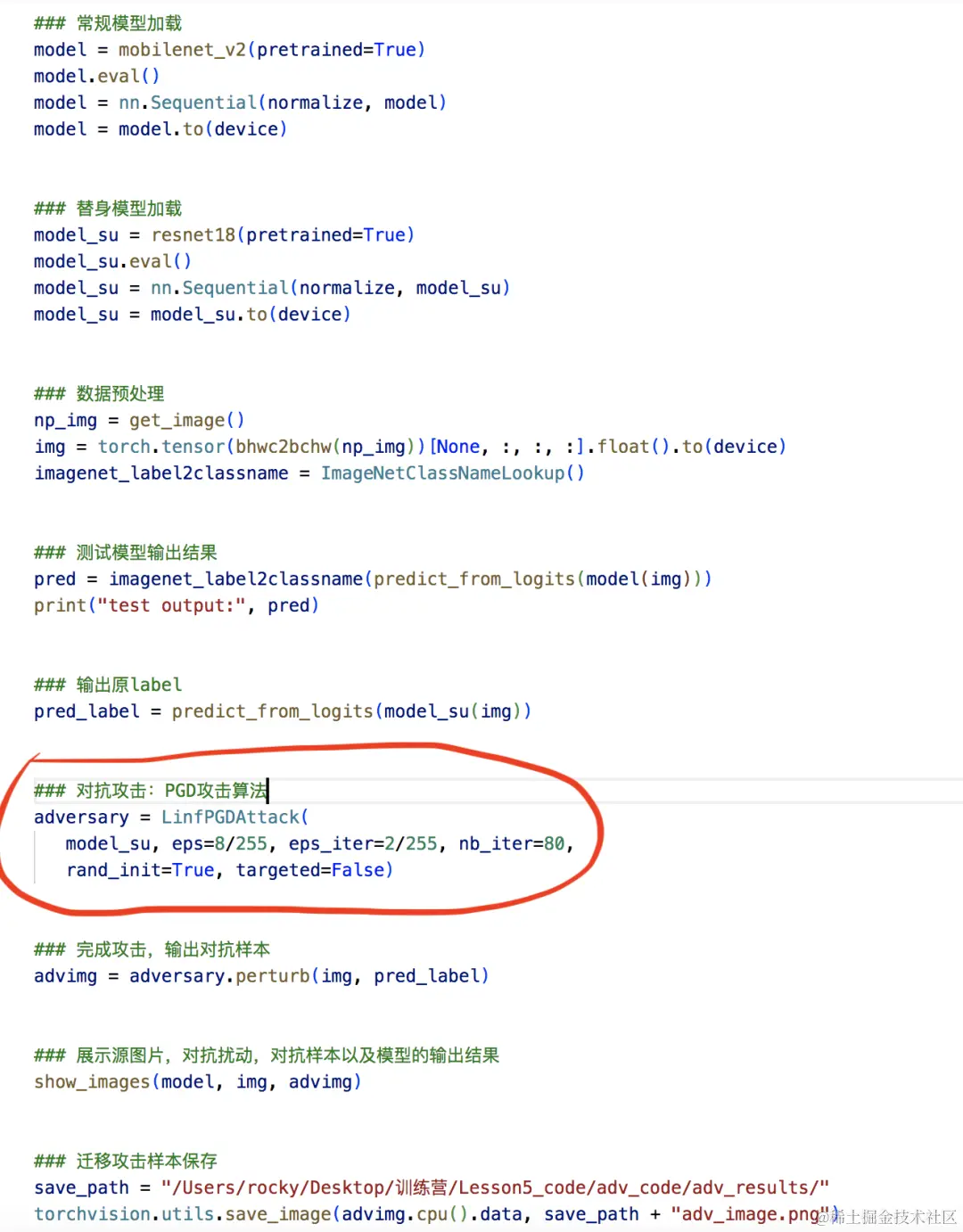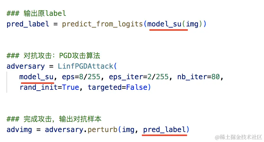 生成对抗样本的代码已经在上面3.1中详解拆解过,大家可以温习一下,主要流程的代码如下: