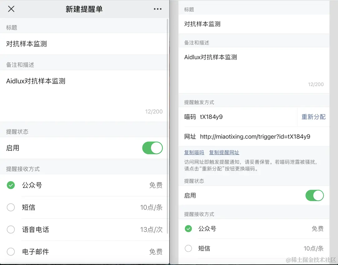 然后我们填写新建提醒的相关信息,点击最后的“保存”,页面会自动加载,中间的部分会自动跳出自己账号专属的“喵码”和“网站”,后面的代码中,我们主要使用“喵码”进行告警的反馈。