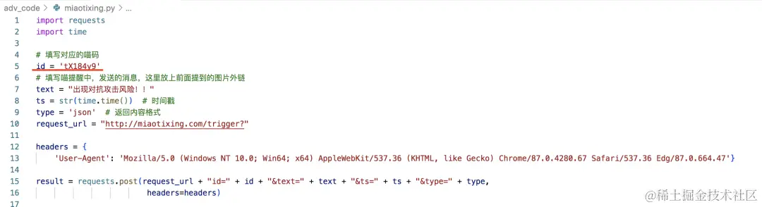 不过需要注意的是,代码中的id要改成自己的“喵码”,不然喵提醒信息会发送到别人那里。