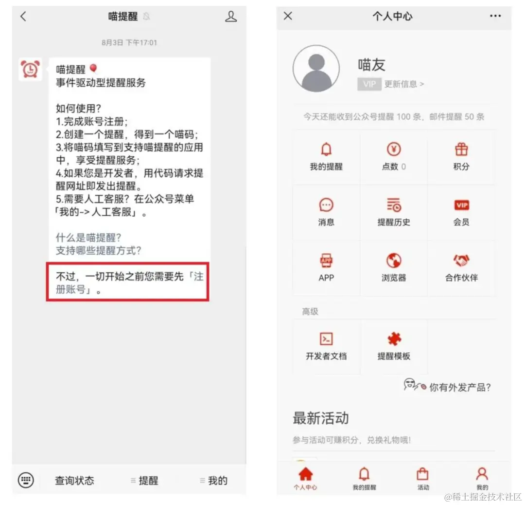 首先关注“喵提醒”公众号,点击回复消息中最后的“注册账号”,填写手机号码进行注册,注册后跳到后台页面可以看到,今天还能收到提醒100条信息,基本上是够用的。