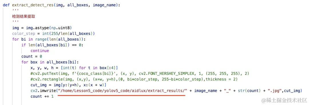 比起第三章的模型推理测试代码,这里我们增加了一个extract_detect_res函数来实现目标区域提取与保存。