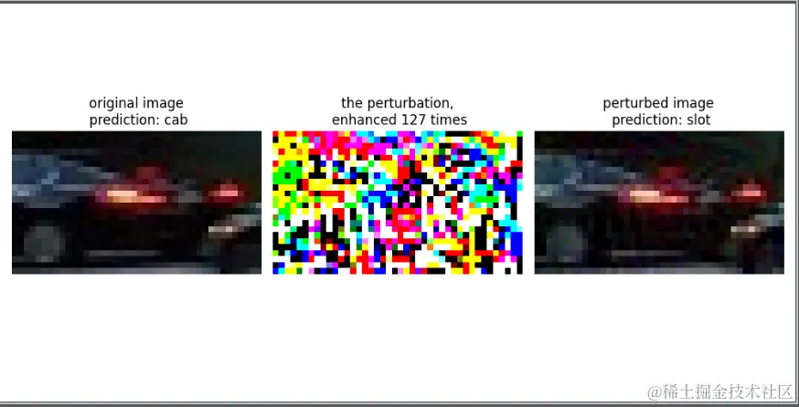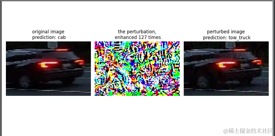 比如左面的车辆小图,原本是cab出租车,经过对抗攻击,生成右面的图片后,再输入ResNet50模型后,如果输出0,则表示对抗样本输出的不成功,没有生成具有安全风险的图片。