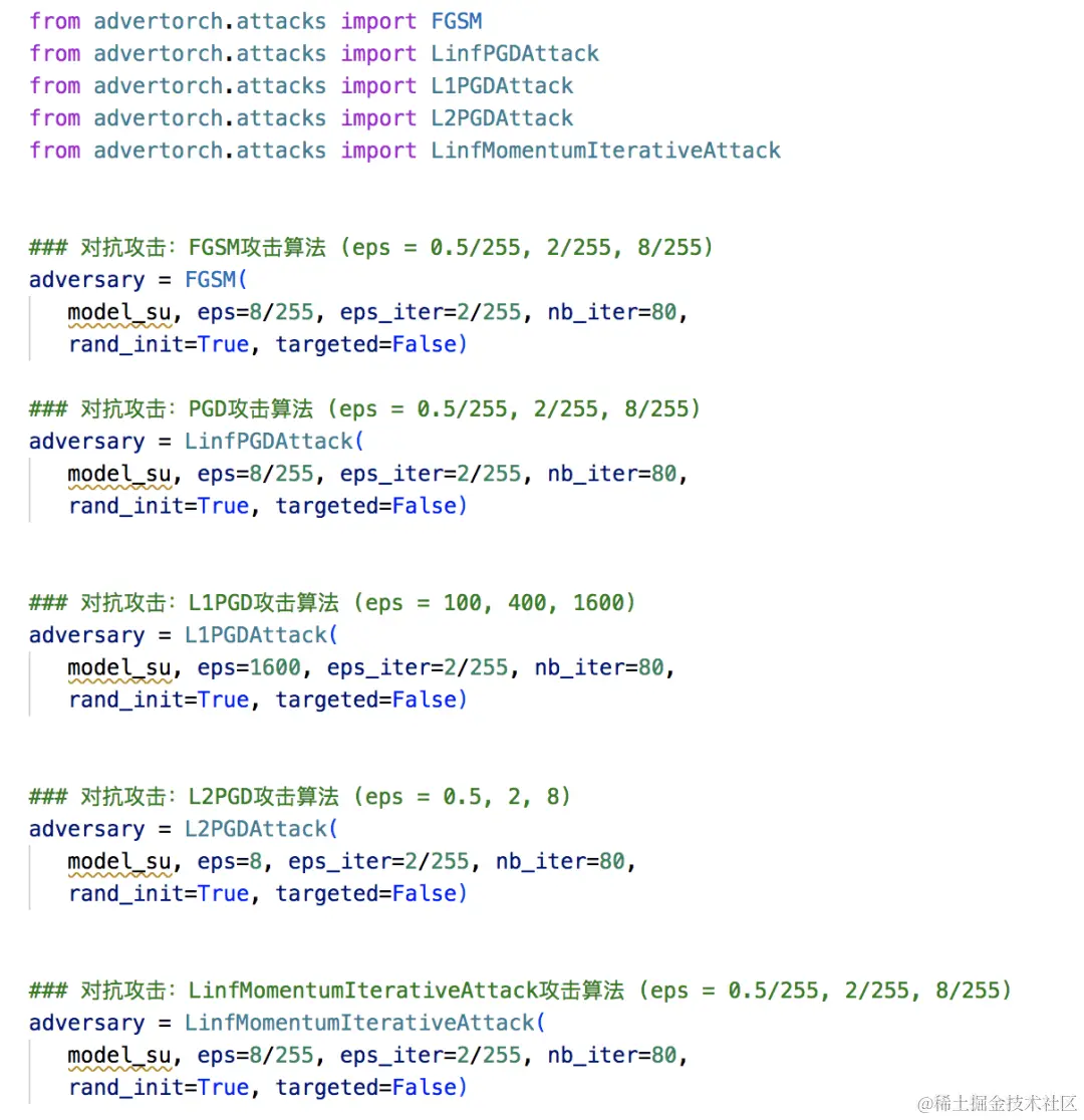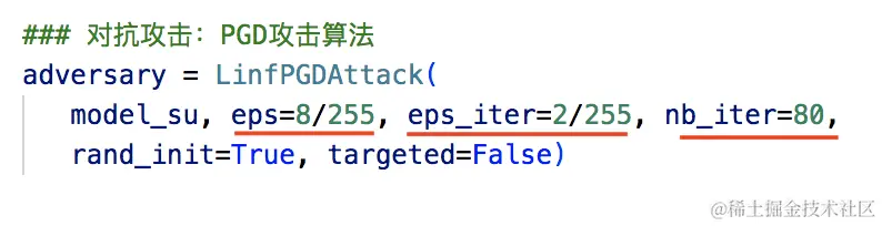 我们还是使用PGD攻击算法,各参数和上一节课保持一致。除了使用PGD对抗攻击算法外,大家还可以使用其他的算法进行尝试,我们将在后面的小节中给出一些示例供大家参考。