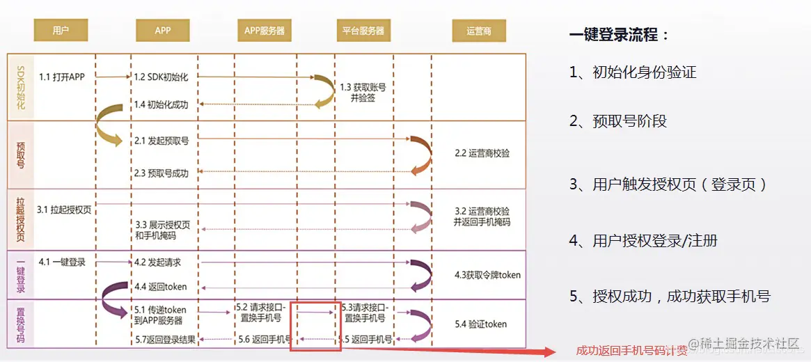 先看下流程图,可以理解为一键登录主要是三个部分:app集成的SDK、应用的后端服务、运营商; 业务App提供需要校验的号码,通过调用运营商数据网关校验所提供号码是否本机号码来进行注册或登录,使用本机号码校验时,用户终端需支持使用SIM卡上网,以实现对运营商数据网关校验能力的调用;当用户终端无法通过SIM卡访问运营商数据网络,可以无缝切换到短信验证码。