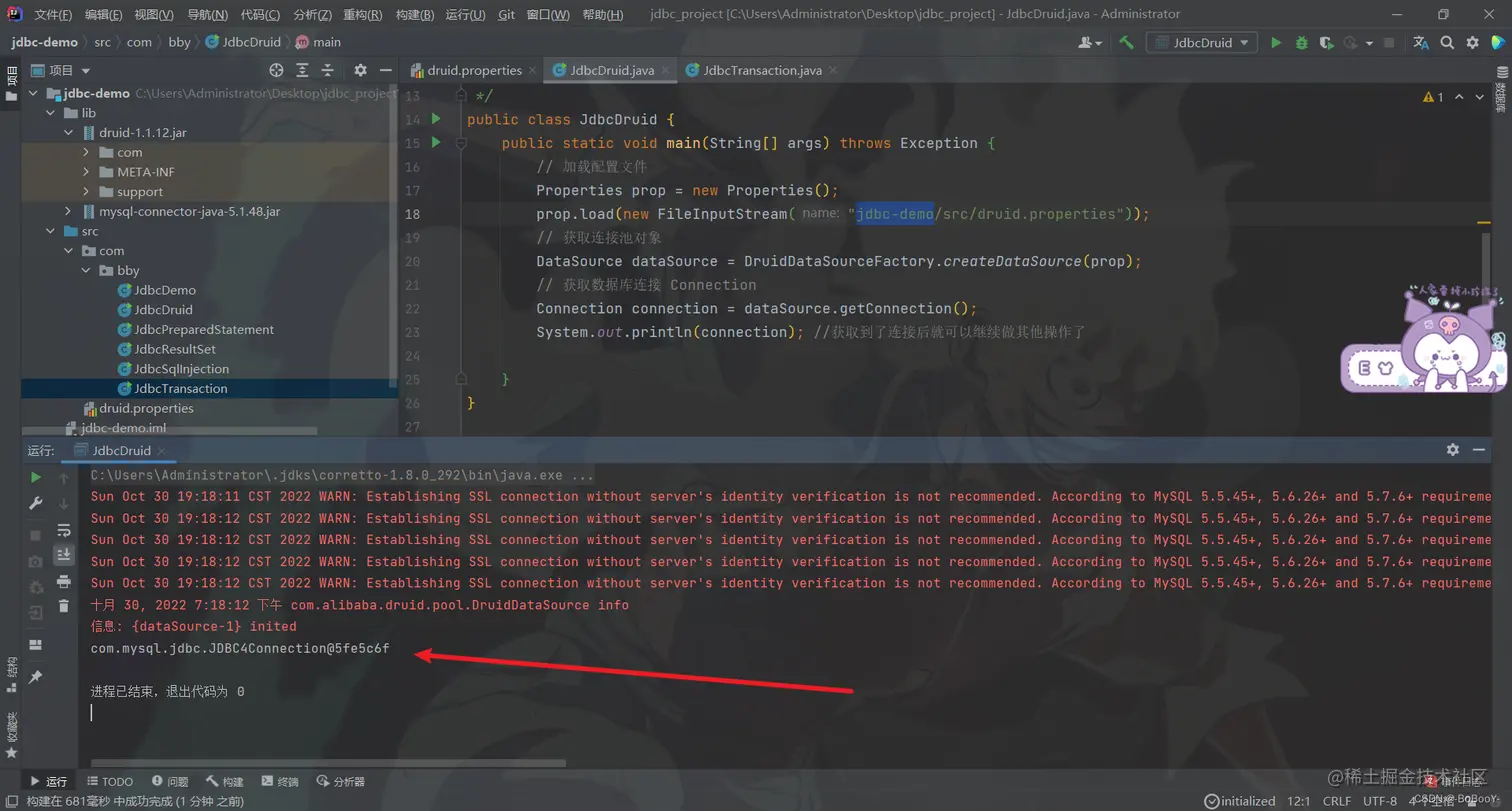 System.out.println(connection); //获取到了连接后就可以继续做其他操作了