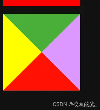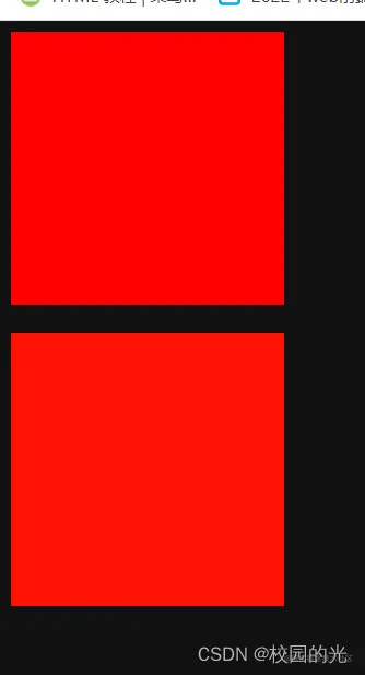 这段代码显示两个红色的正方形,第一个就是大小的红色正角形,第二个则是由边框构成的正方形,两个正方形大小一样,左右上下边框各一对,一个边框100px一对200px,两个正方形大小一样。