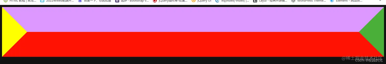 这是不设置宽高 光设置边框的结果,所以为了得到任意四个三角形的一个 我们要设置 宽高,将宽高设置成0px,缩小中心点让它变成三角形而不是梯形,也改变了默认的100%宽度属性。