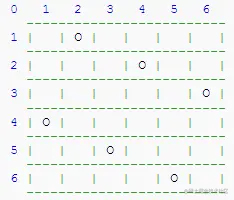 一个如下的 的跳棋棋盘,有六个棋子被放置在棋盘上,使得每行、每列有且只有一个,每条对角线(包括两条主对角线的所有平行线)上至多有一个棋子。
