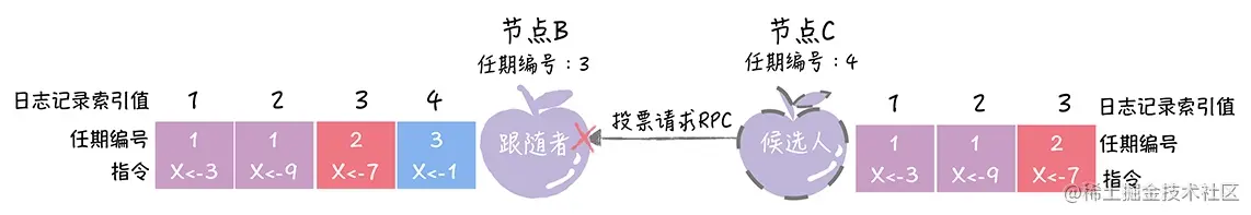 - 日志完整性高的节点,拒绝给日志完整性低的节点投票