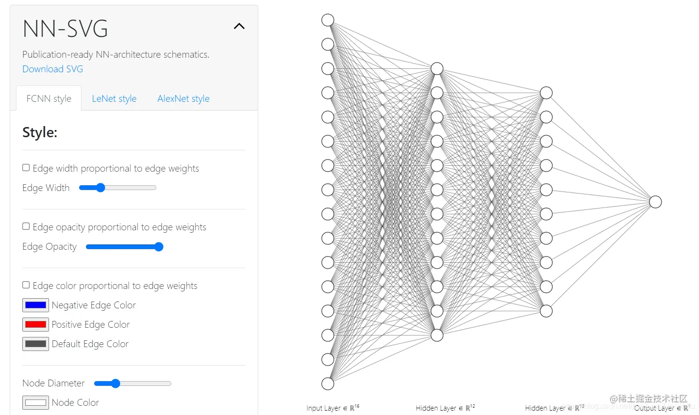 但是,NN-SVG仅仅可以显示简单的隐藏层,并不能对隐藏层的类型加以区分绘制。
