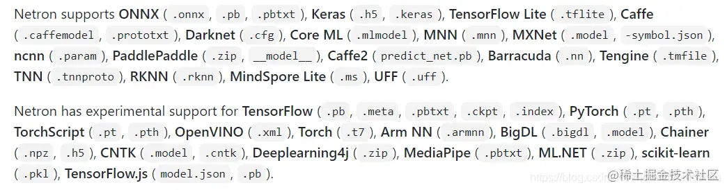 Netron是一个对神经网络以及各类机器学习、深度学习算法进行可视化的工具,分为软件版与在线版(在线版网页:netron.app/ )。绘制时我们需要先建立并保存自己的模型(并且还是要运行之后的,因为其会显示模型中具体参数的变化情况),随后用其打开即可。Netron支持的模型格式如下所示。