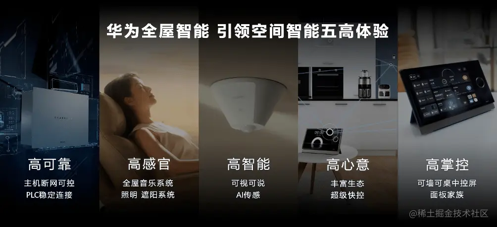 与之相对应的,则是华为全屋智能升级迭代后的“1+2+N”全屋智能解决方案,并站在普通用户的立场上,塑造了“五高”极致体验 ,即高可靠、高掌控、高感官、高智能、高心意,有别于市场上主流的单点式智能体验,华为的切入点是系统的场景化空间体验,将智能化渗透进生活场景中,通过不需要学习、拥有自主选择权的方式,输出用户认同的生活理念。
