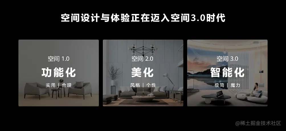 “空间3.0”并非杜撰出的说法,空间1.0属于物质满足的阶段,典型的现象就是上世纪90年代开始流行的冰箱、彩电、洗衣机为主的“大三件”;空间2.0开始了对美学的追求,过去二十年中形成了欧式、美式、新中式等多种设计风格。但空间的进化并非是替代关系,而是传承与融合,冰箱、彩电、洗衣机等至今还是家庭的标配,但设计时则会更多考虑到家居环境融合。
