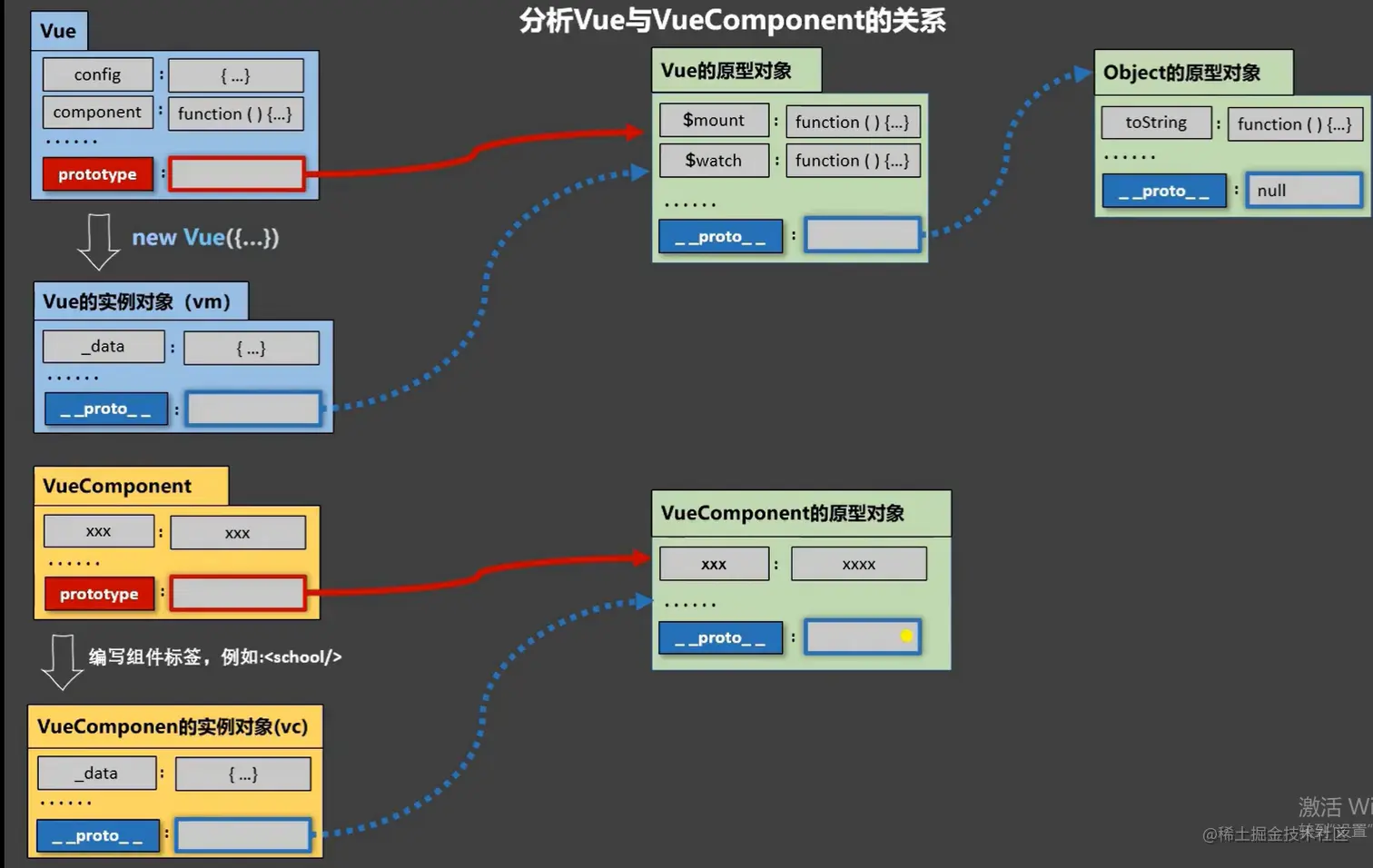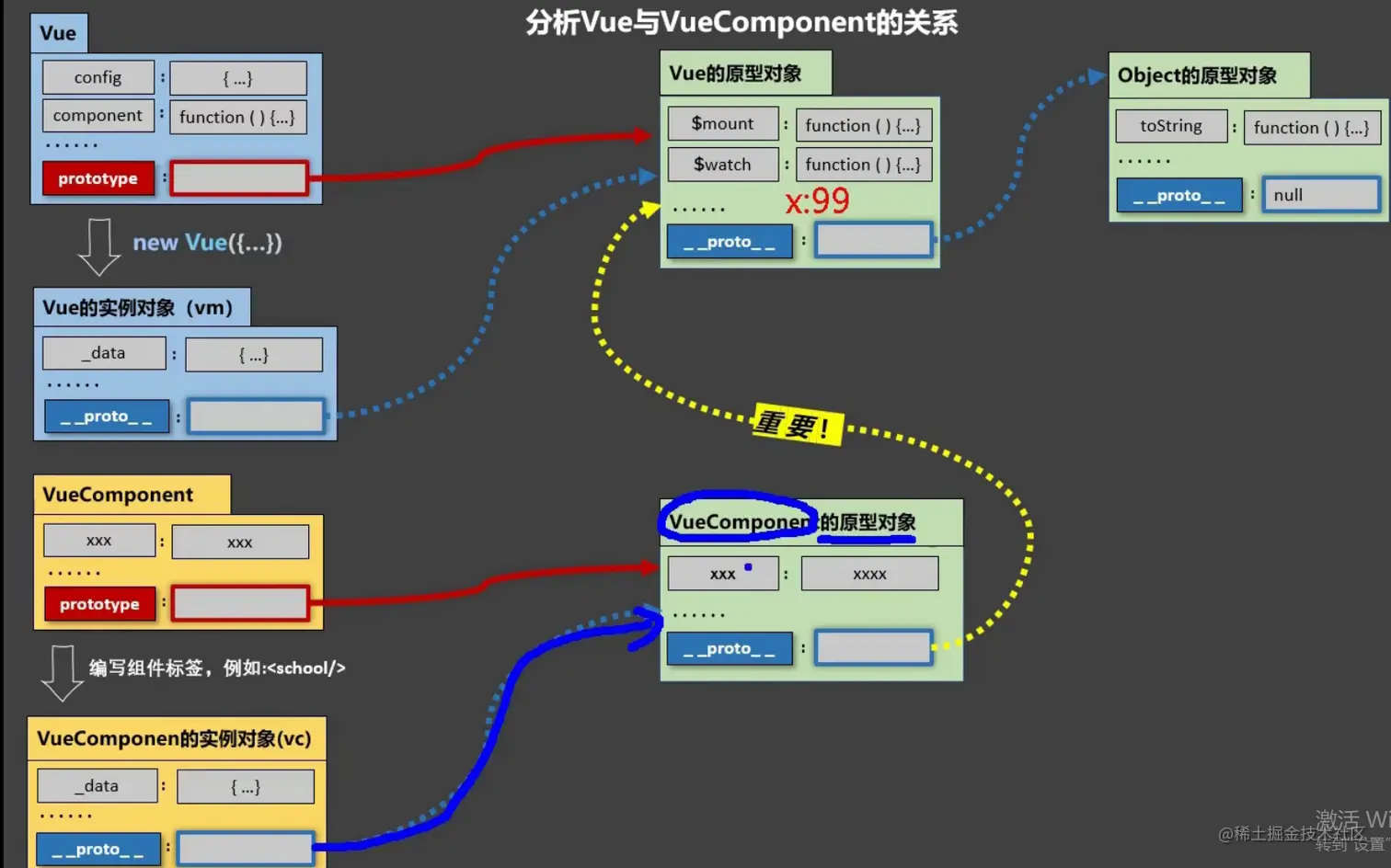 为什么要有这个关系:让组件实例对象(vc)可以访问到 Vue原型上的属性、方法。