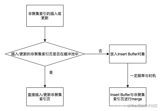 Insert Buffer对于非聚集索引的插入或更新操作,不是每一次直接插入到索引页中。流程如下: