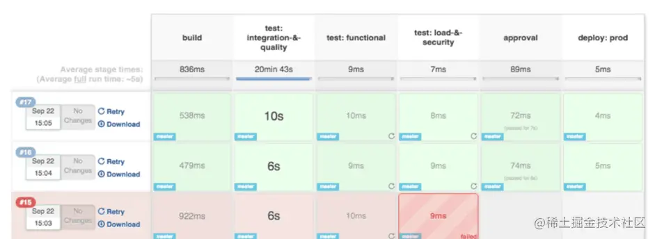 Jenkins根据定义的阶段以图形方式拆分流水线执行,并显示它们的持续时间以及是否成功