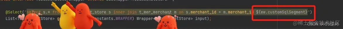 ${ew.customSqlSegment}和@Param(Constants.WRAPPER)实现,将条件构造器作为参数。 -