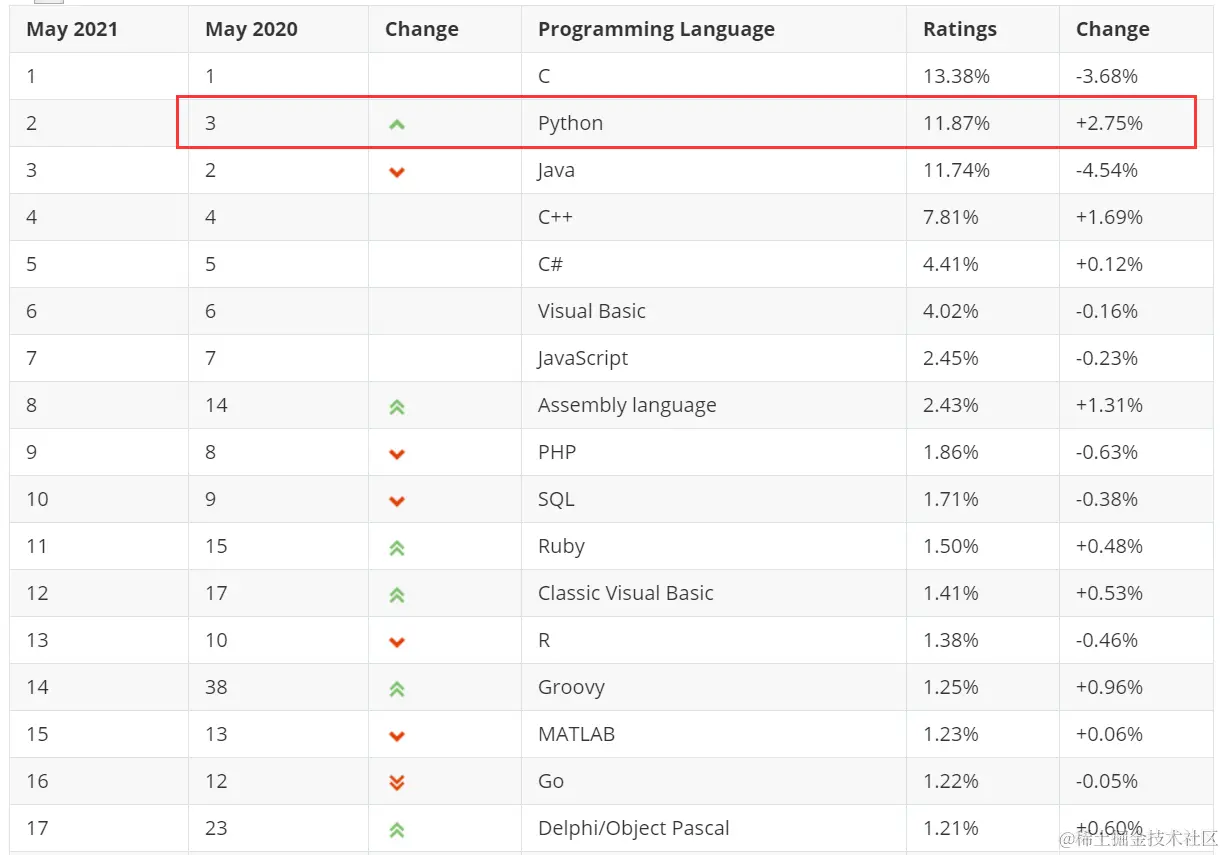 Python在发布之初还只是一个小众语言,当时(指上个世纪九十年代)的流行语言主要还是C语言。但是在2021年5月发布的最新