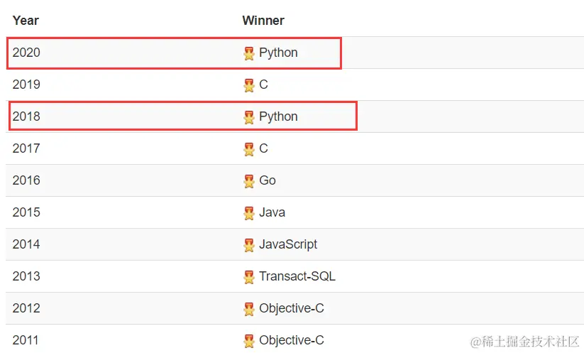 上图编程语言排名图来自网页 tiobe.com/tiobe-index… 上图为近十年每年评选出的明星语言,可以看到在2018和2020年python均为明星语言,表现已经和C语言不分伯仲