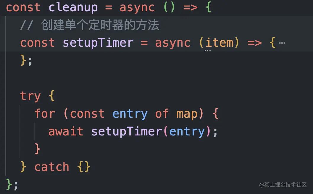最重要的当然是cleanup函数了,里面定义了setupTimer函数,然后for of循环,await处理map里的每个键值对: