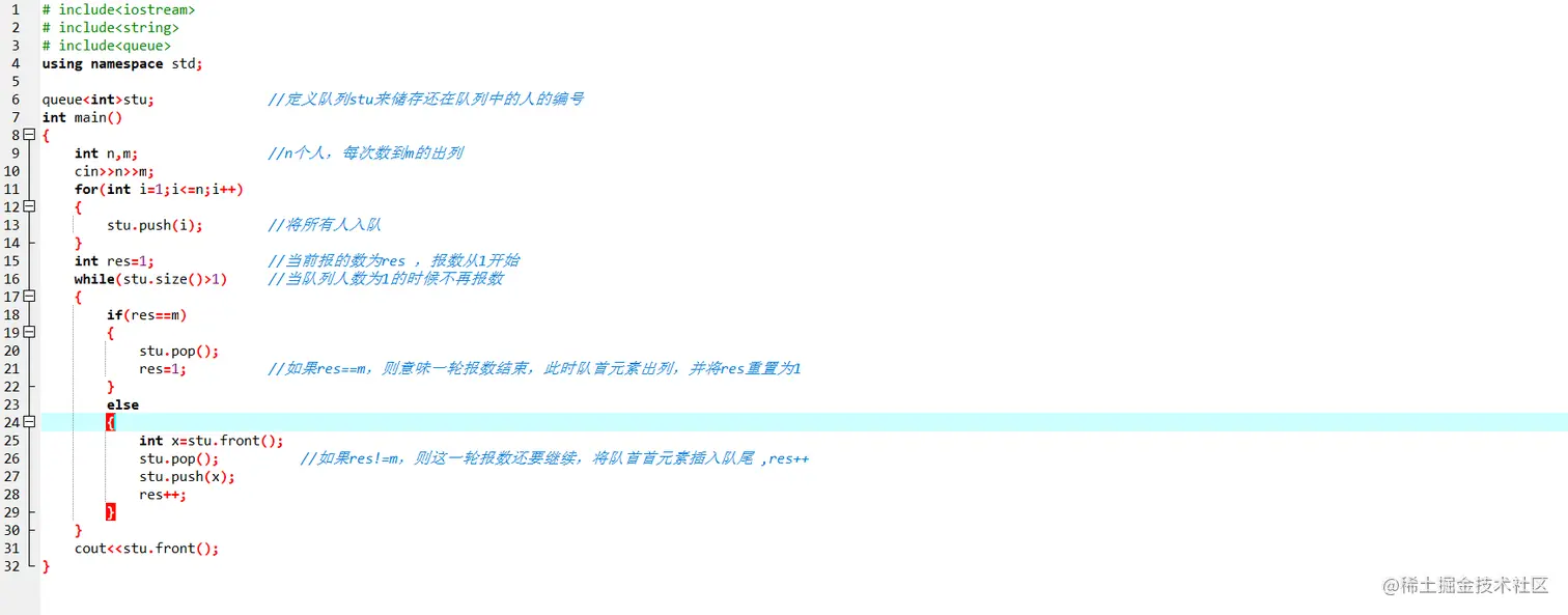 用队列实现约瑟夫环最主要的一个步骤是每次报数如果还没有报到指定的数m都要让队首元素插入到队尾,这样不仅可以维持之后报数的顺序,同时保证当报到m的人就是在队首,方便出队
