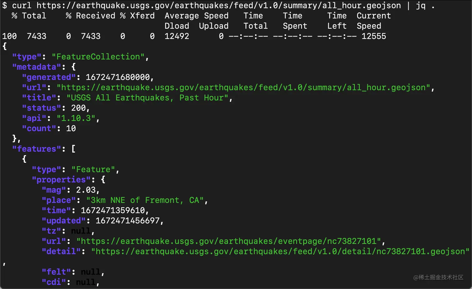根据 USGS 网上所提供的信息,我们可以在地址 earthquake.usgs.gov/earthquakes… 找到相应的地震信息数据。我们可以通过如下的命令来进行查看: