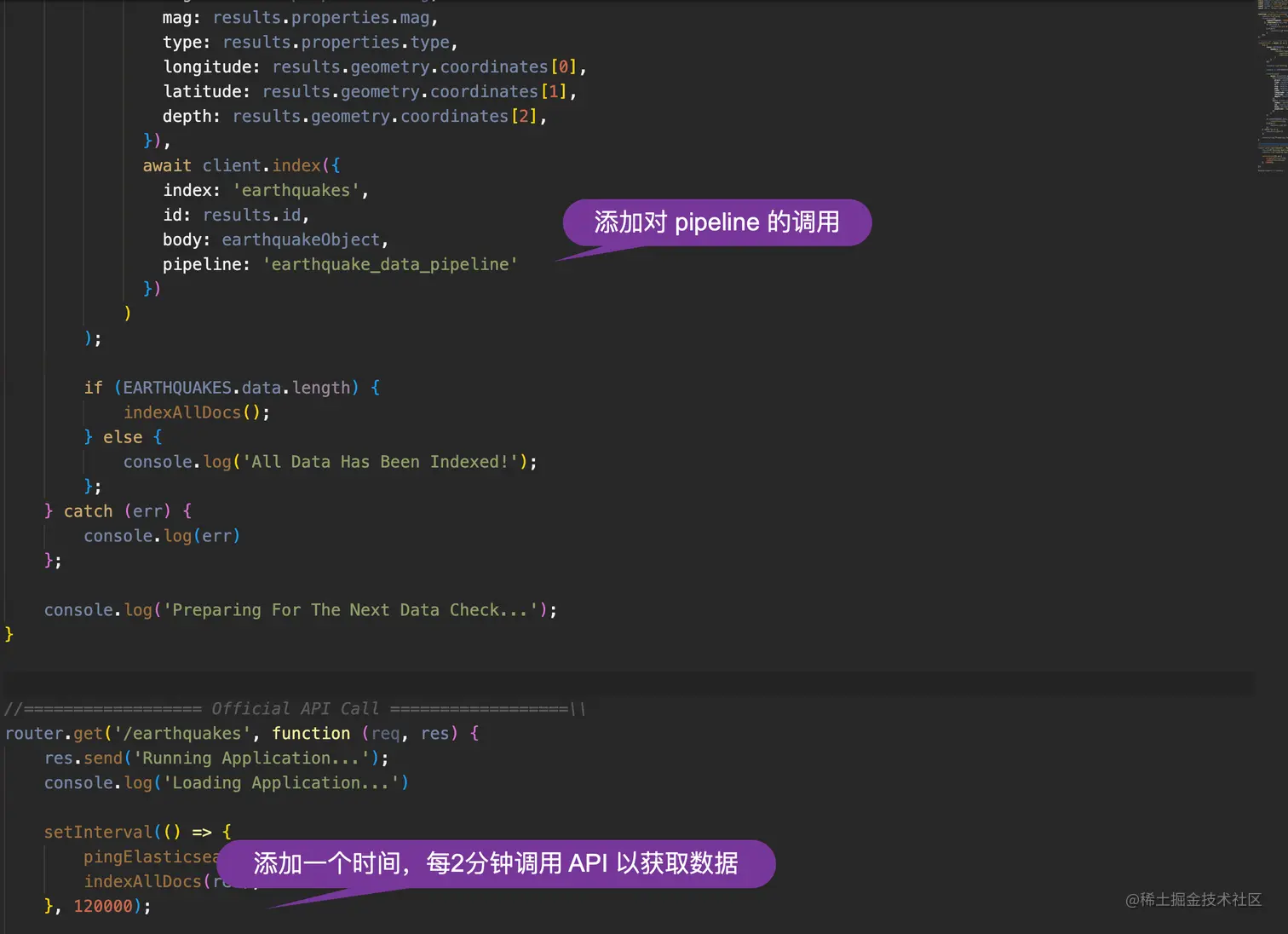 我们接下来需要修改 data.js 文件来使用这个 ingest pipeline: