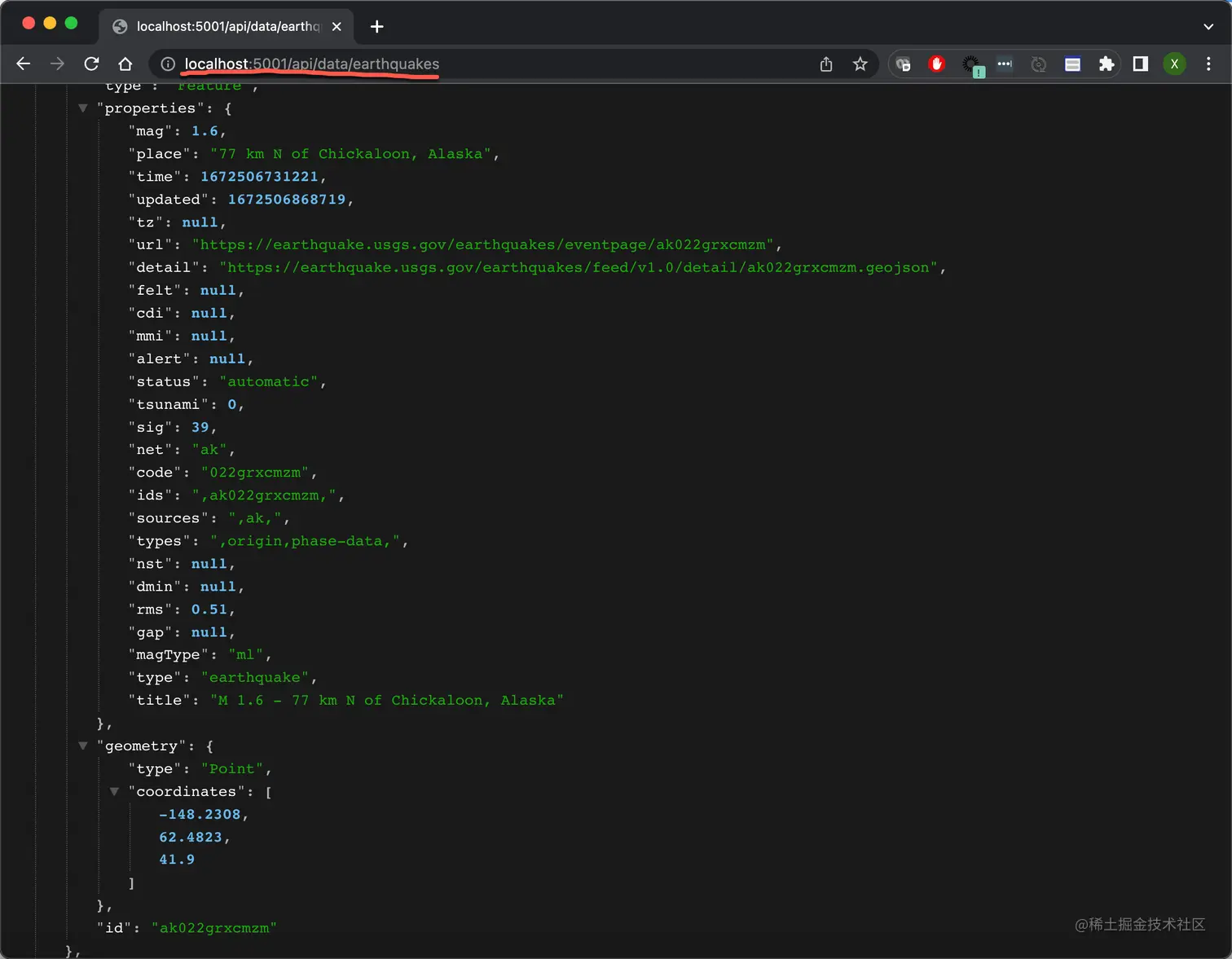 "id"****: "nc73827101",这是一个地震特有的 id,我们将以这个 id 成为数据的 id。