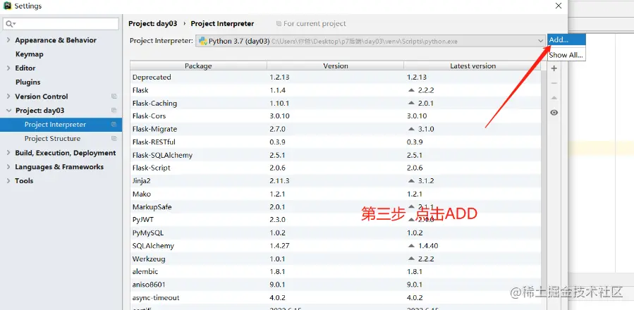 第二步 选择与文件夹同名的设置下的 Project Interpreter