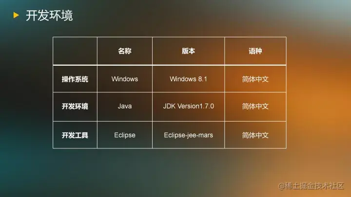| 开发环境 | Java | JDK Version1.7.0 | 简体中文 |