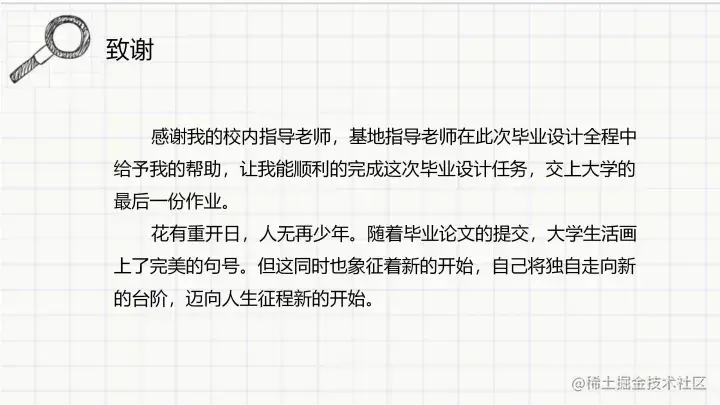 感谢我的校内指导老师,基地指导老师在此次毕业设计全程中给予我的帮助,让我能顺利的完成这次毕业设计任务,交上大学的最后一份作业。